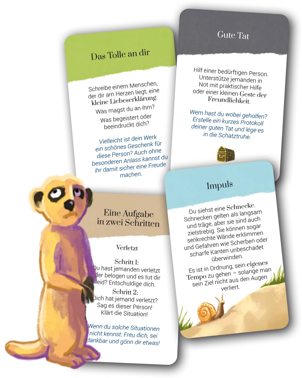 - 50 Spielkarten mit abwechslungsreichen und psychologisch fundierten Herausforderungen sowie 7 wertvollen Impulsen